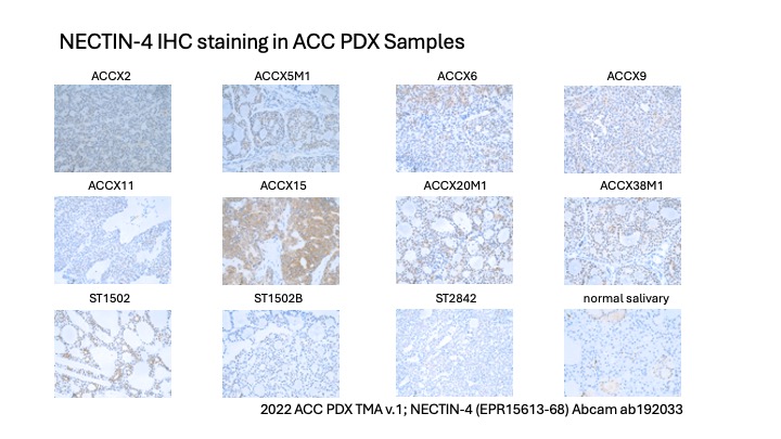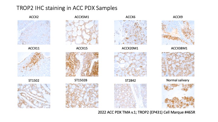 - Sixty percent of ACC tumors express high levels of AXL (defined as >25% positive cells) (Humtsoe et al., AACR 2022).